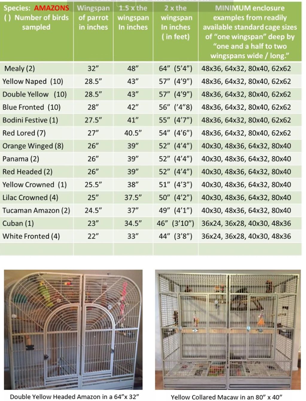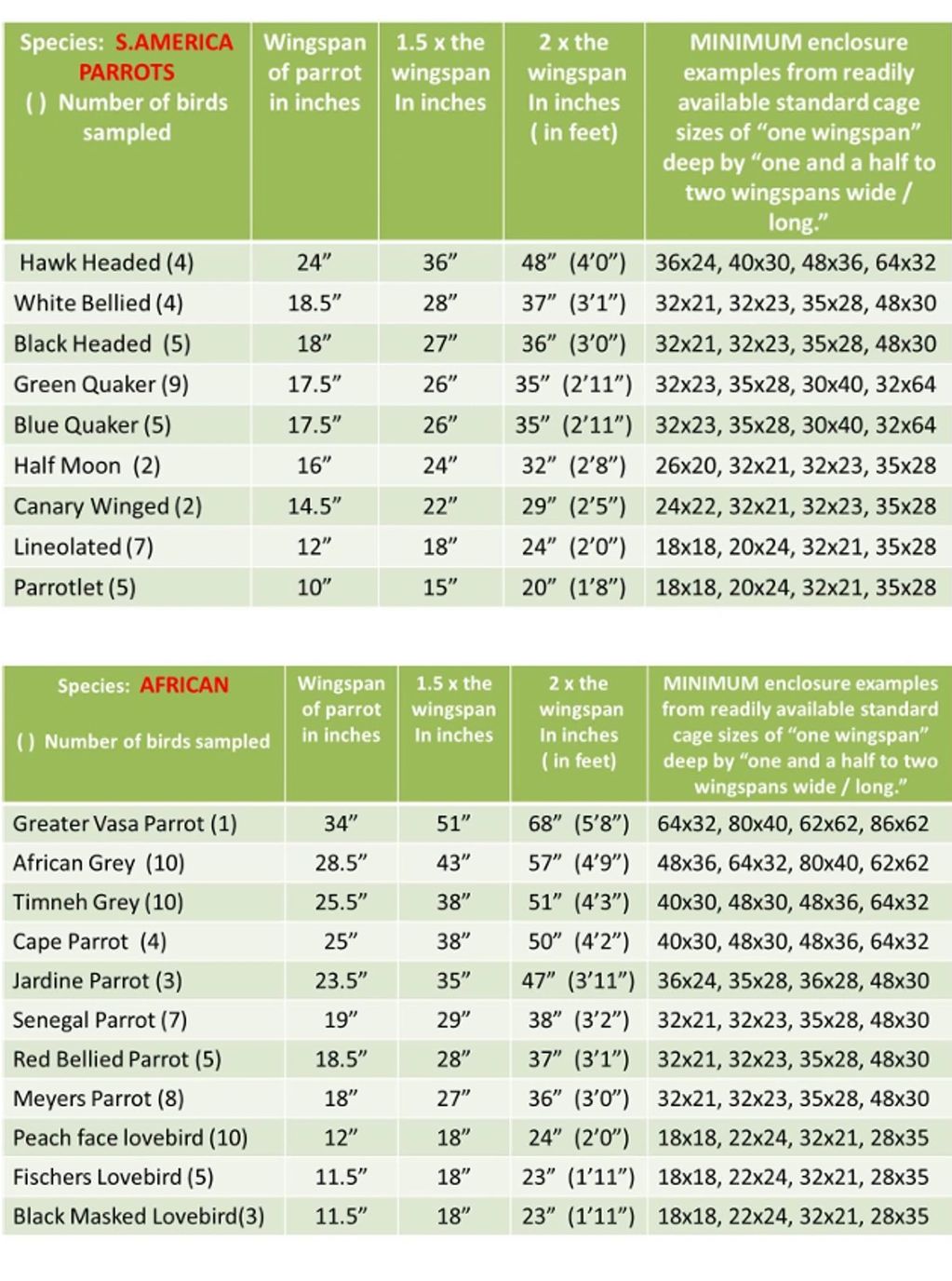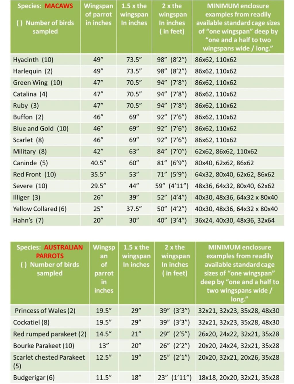 "Minimum cage sizes: Parrot species need a minimum of 2-3 x the wingspan in width and depth"