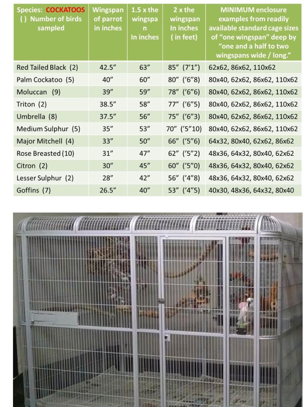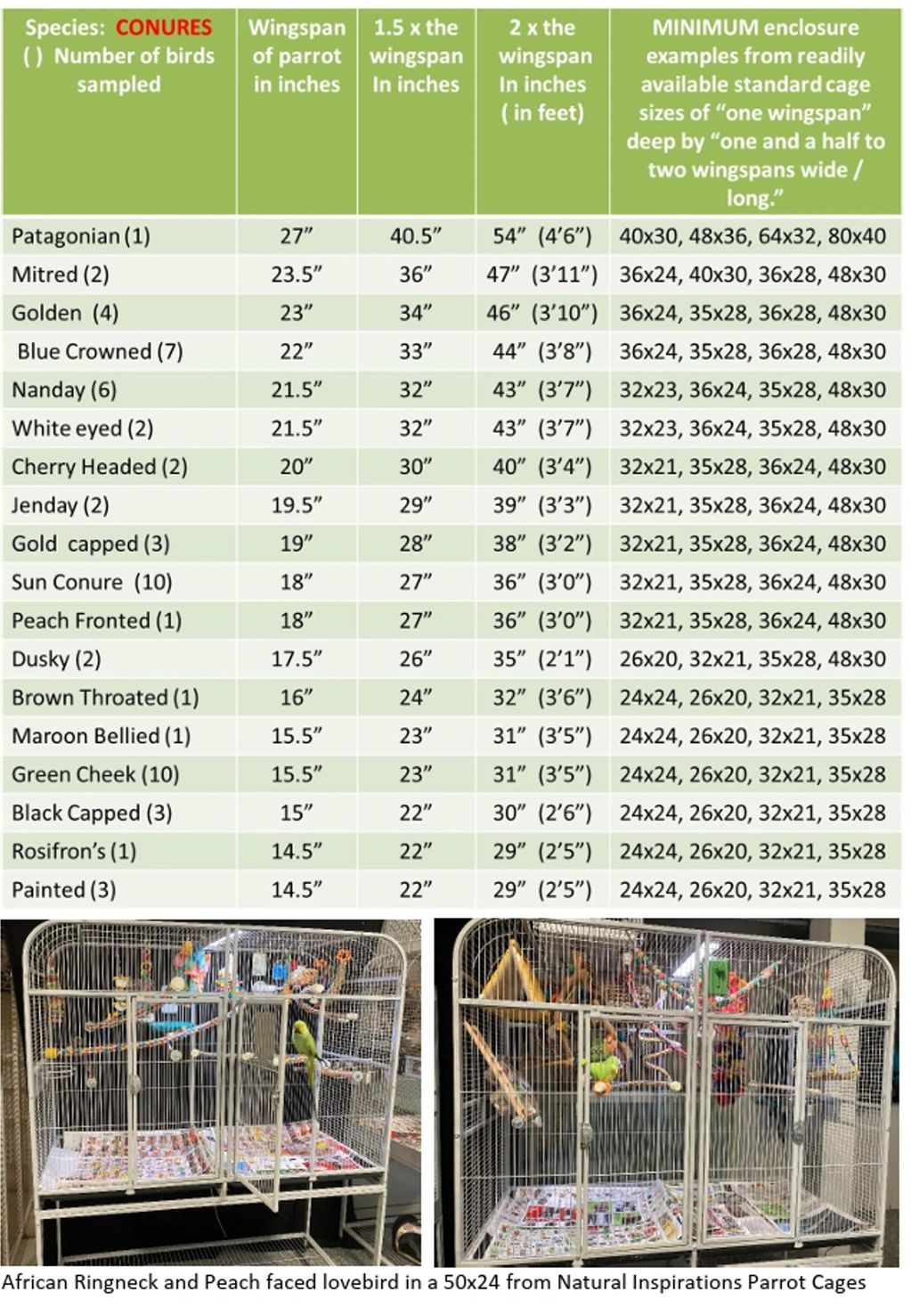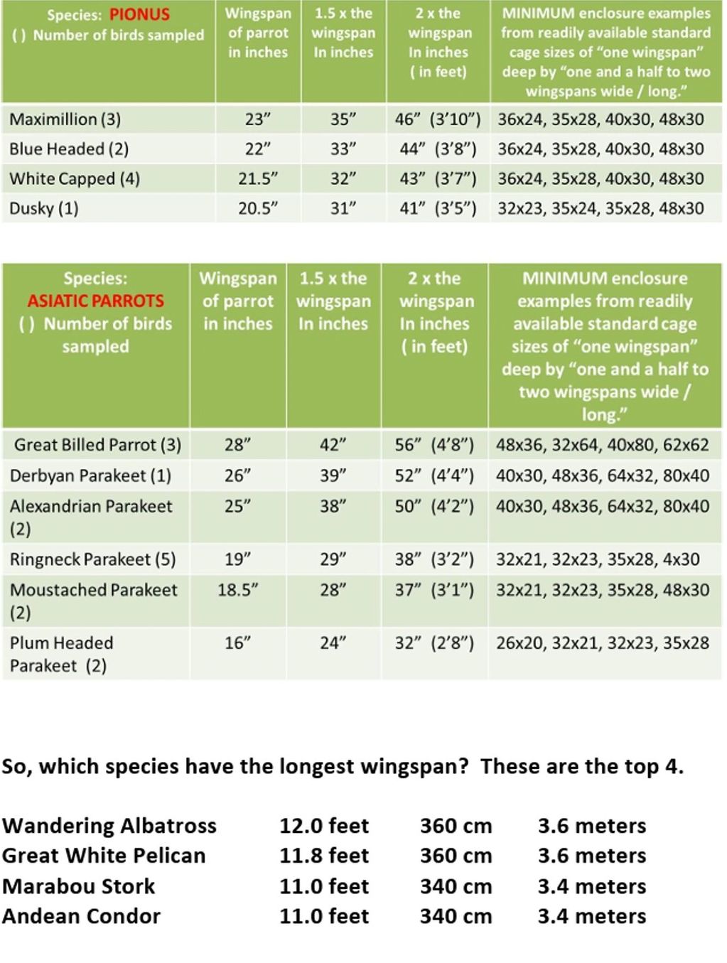 "Minimum cage sizes: Parrot species need a minimum of 2-3 x the wingspan in width and depth"