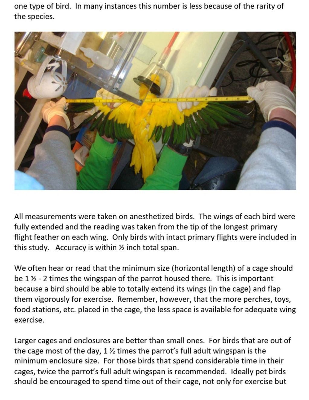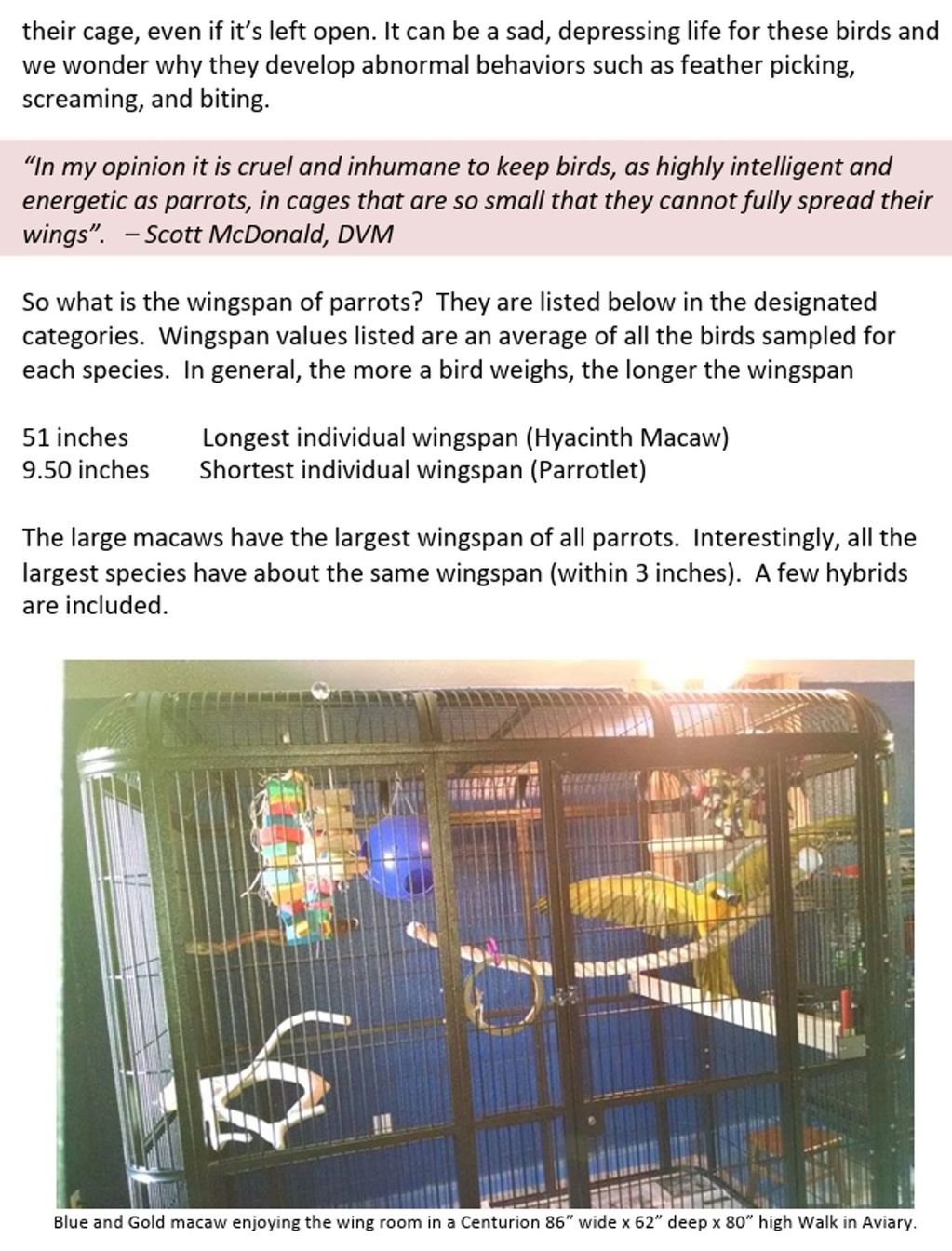 “Parrot cages should be housed in, at a minimum, an enclosure two times a birds wingspan in length and be able to flap their wings."