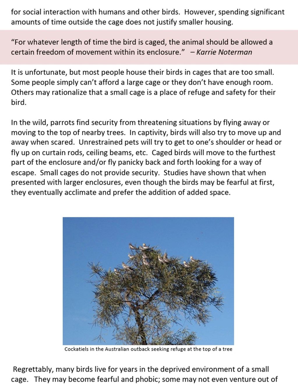 the birds’ natural wing span in all directions. Ideally all birds should have cages/aviaries large enough to accommodate flight."